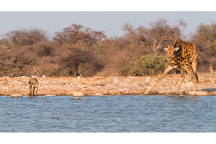 Hyäne und Giraffe am Wasserloch, Etosha